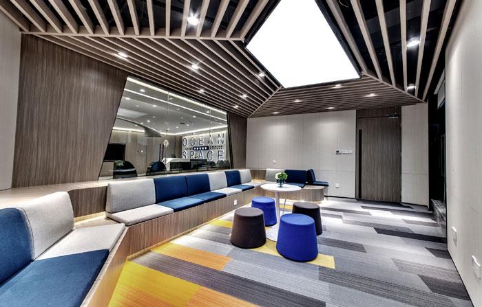 4.员工休息区是员工与企业交互的空间节点。一个轻松愉快的企业文化氛围,大多体现于员工工作闲暇时的沟通交流。一般情况下员工以及管理层之间的交流,在大办公环境下会分散其他员工的注意力,而在会议室又显得正式或局促,因此,一些自然的沟通交流多在员工休息区进行。